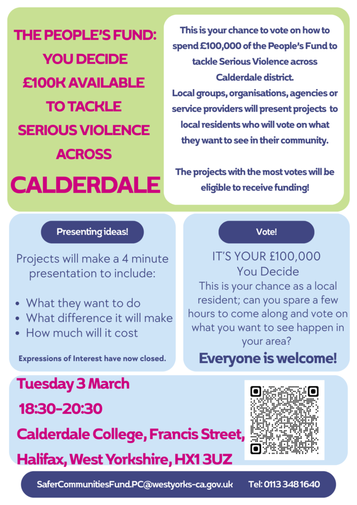 The West Yorkshire Combined Authority Violence Reduction Partnership is wanting to give people across Kirklees, Bradford and Calderdale the chance to have their say on what the new “Peoples Fund” goes towards.